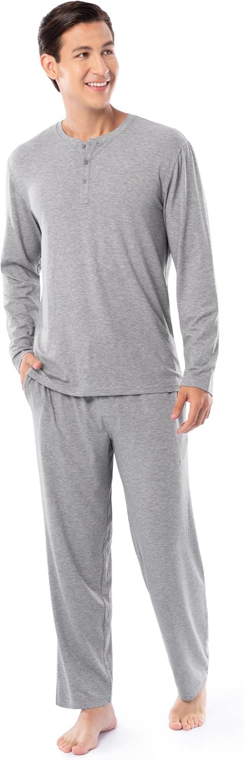 Fruit of the Loom Men’s 360 Stretch Long Sleeve Henley Top and Pant Sleep Pajama Set(Grey Heather)