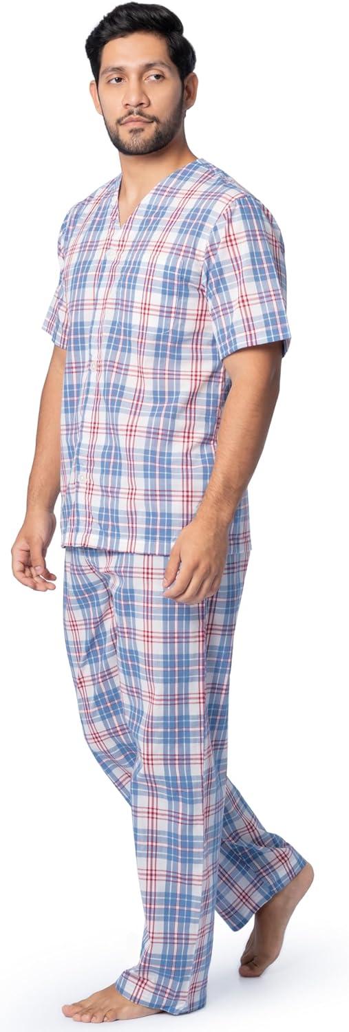 Fruit of the Loom mens Broadcloth Short Sleeve Top and Long Pants Pajama Set(Ivory/Blue/Red Plaid)