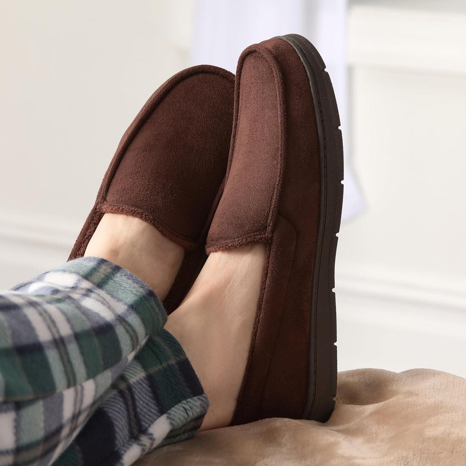 Fruit of the Loom Men’s Moccasin Slippers – Memory Foam Indoor Outdoor House Shoes, Cozy Fuzzy Footwear for Men, Dad, Husband, Christmas Gift, Non-Slip Suede Design(Brown)
