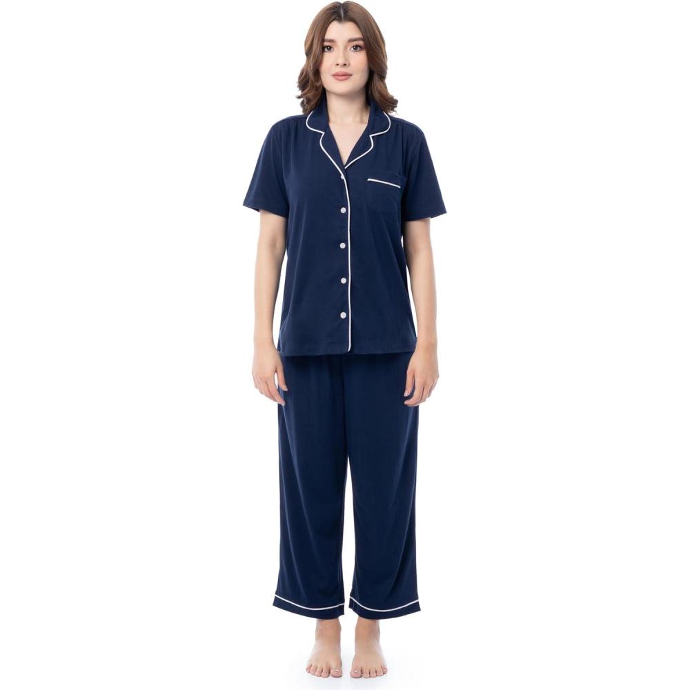 Unwind in ultimate comfort and timeless style with the Fruit of the Loom Women's Piped Button-Down Pajama Set. This two-piece set includes a button-front top with a convenient chest pocket and a relaxed, cropped wide-leg pant. Crafted for maximum comfort, the soft, breathable fabric ensures you stay cozy throughout the night, while the covered elastic waistband provides a secure yet flexible fit. Designed for a smooth, irritation-free experience, this pajama set is perfect for lounging at home or enjoying a peaceful night’s sleep.